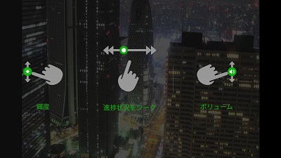 画面上で左右にスライドすることでシークバーを表示・上下にスライドするとボリュームの調節が行えます。またインターフェイスがかなりシンプルで、機能は少なめとなっています。