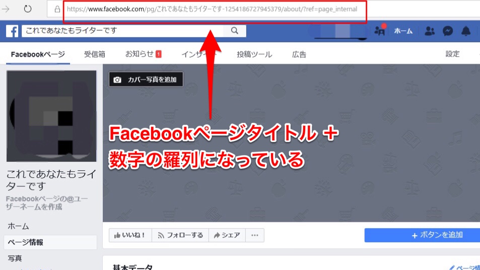 Facebookページを作成すると、URLは「https://www.facebook.com/」にFacebookが自動的に作成したアドレスが続きます。