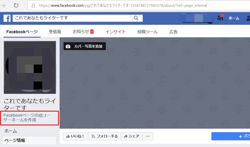 Facebookページを作る段階でユーザーネームを作成する必要はなく、その場合はFacebookページタイトルのすぐ下に「Facebookページの@ユーザーネームを作成」と表示されます。
