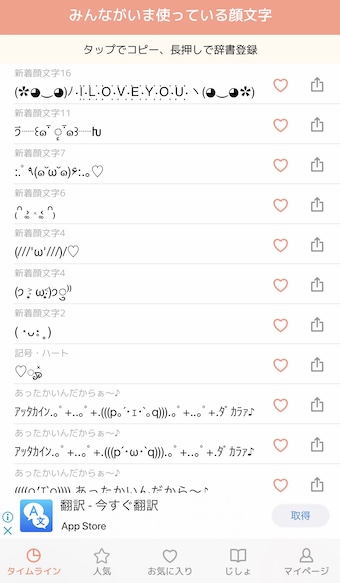 お気に入りの顔文字はハートマークを押して登録してください。