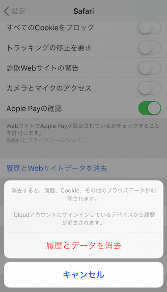 「履歴とデータを消去」をタップすると、削除が実行されます。