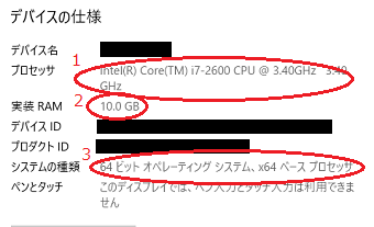 ここの項目でわかるのは、「システムのビット数」です。詳しく説明しようとすればキリがありませんが、数字が大きいほど、処理が速いと思ってもらえれば間違いはありません。
