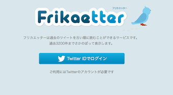 最初のツイートを見たいと思った時には、古い順で見ることができるフリカエッターがおすすめです。3,200件以上前のツイートは残念ながら見ることができませんが、非常に便利です。