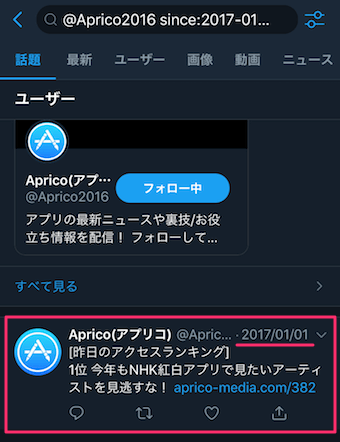 例に挙げた条件でApricoアカウントを検索すると、2017年1月1日〜2日のツイートのみが表示されます。