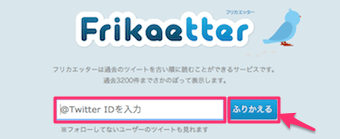 そして、過去のツイートを見たいアカウントのIDを入力し、ふりかえるボタンをクリックします。