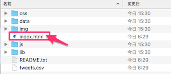 ファイルを開き、index.htmlをクリックすると、ブラウザからツイートを確認することができます。