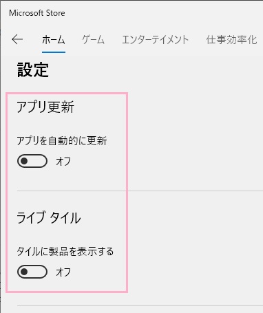 設定画面が表示されるので、「アプリを自動的に更新」と「タイルに製品を表示する」のボタンをクリックしてオフにしましょう。