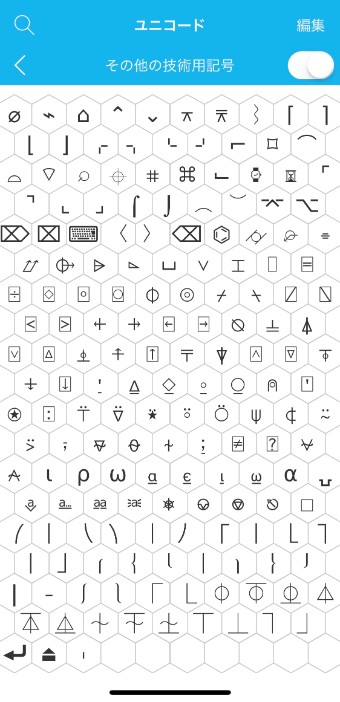 ユニコードの場合ですと、アプリを開くとこのようにいろいろな文字が入っています。見たこともないような文字がたくさんありますので、開いて見てみて好きな文字を探してください。