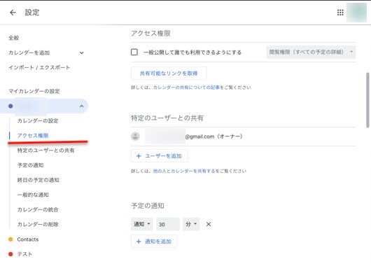 PCからGoogleカレンダーを開き、共有の操作と同じように設定画面の「アクセス権限」を開きます。