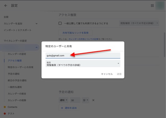 さらに作成したGoogleカレンダーは特定のユーザーを指定することで、カレンダーを共有することができます。