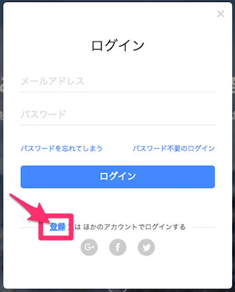 すると、ログインのポップアップが出てきますので、登録をクリックします。