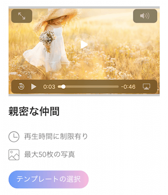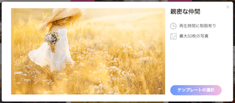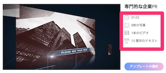 テンプレートに写真/動画/文字がどの程度入れることができるのかは、このテンプレート詳細画面で確認できます。