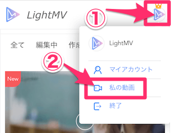 完了したら、上部にあるアイコンマークをタップし、私の動画をタップします。