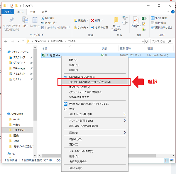 該当ファイル(ここではExcel)を右クリックし、表示されたポップアップから「その他のOneDrive共有オプション」を選択しましょう。
