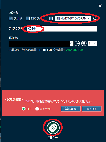 書き出し設定に問題がなければ、緑のディスクのアイコン、コピーボタンをクリックし、書き出しに移ります。