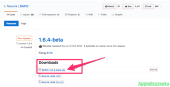 「Shiftit」をダウンロードできるgithubのreleasesページから、「ダウンロード」を選びクリックします。