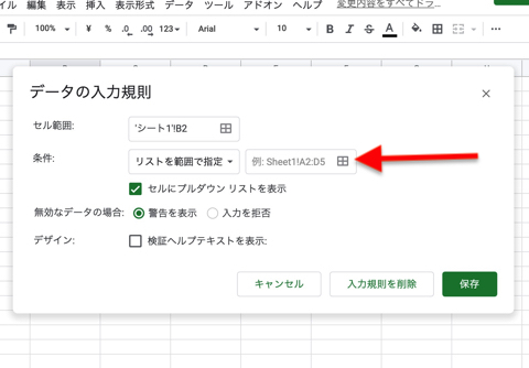「条件」は「リストを範囲で指定」を選択し、左にある「田」をクリックします。