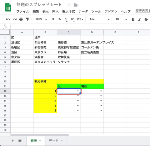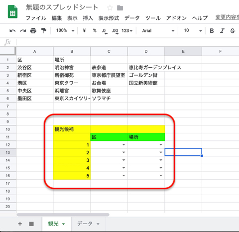 プルダウンリストを作成するシートは「観光」、連動に使うシートは「データ」と名前を変更させました。