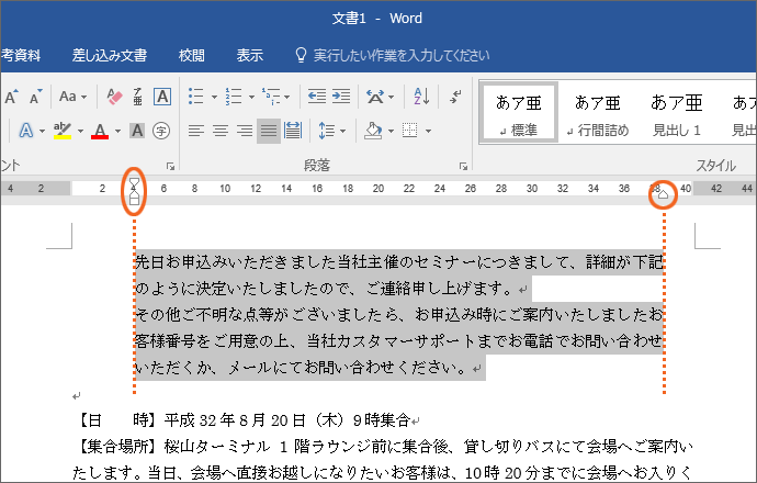 ホームタブのインデントを増やす・減らすでインデントの調整をしても、インデントマーカーが動いて位置が表示されます。