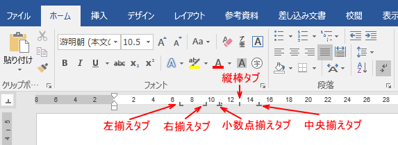 ルーラーの左揃えタブなどのマークをクリックして、ルーラーとリーダータブを表示させます。