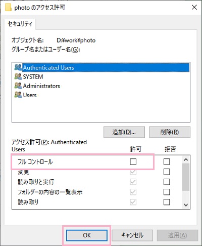 アクセス許可を与えたいユーザー名をクリックしたら、下部に表示されている項目欄の「古コントロール」の「許可」チェックボックスをクリックしてオンにしてから「OK」をクリックしましょう。これでアクセス権が付与されます。もしセキュリティタブに「このオブジェクトのプロパティを表示するには、読み取りアクセス許可が必要です。」と表示されている場合は、「詳細設定」ボタンをクリックします。