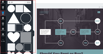 図形は編集画面左の[素材]に用意されており、それらを使ってフローチャートの作成が可能です。