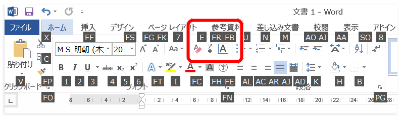 「Alt」を押して「H」を押すと、上にアルファベットが表示されます。