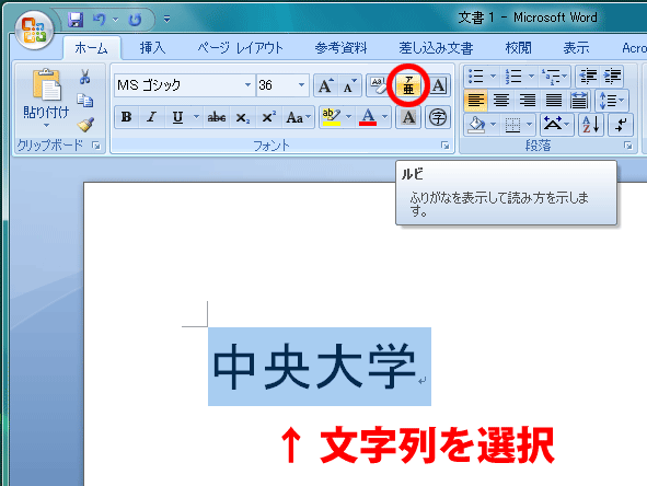 最初に、ルビを振りたい文字を選択します。