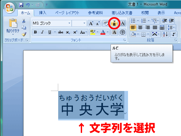 ふりがなを振りたい文字を選択します。