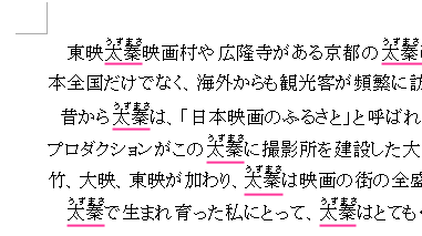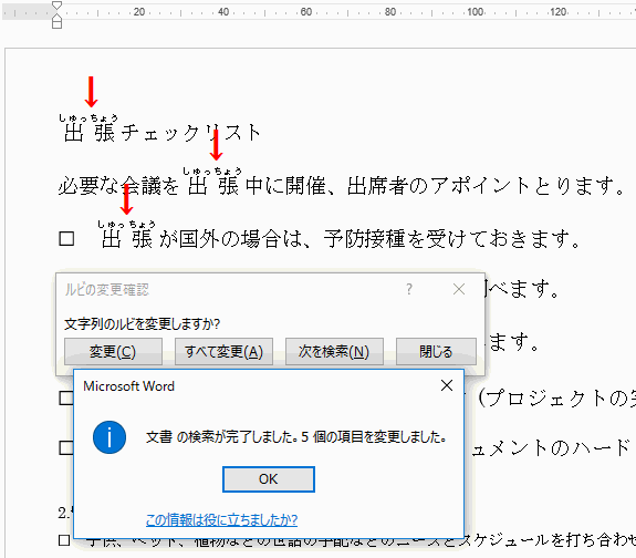 これで、文書中の出張という文字が自動で検索され、全てにひらがなのルビが適用されます。