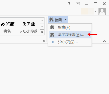 ホームタブの「高度な検索」をクリックします。