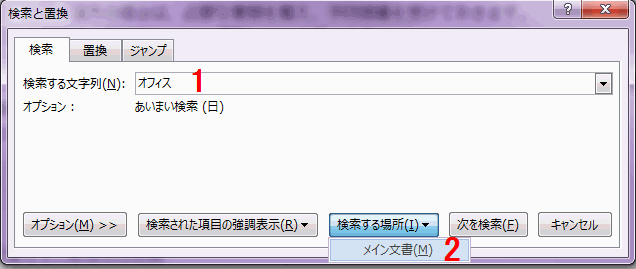 検索と地検の「検索する場所」で「メイン文書」を選びます。
