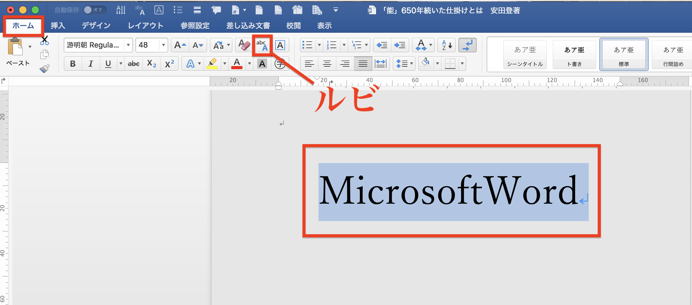 ルビを振る文字を選択しておきます。
