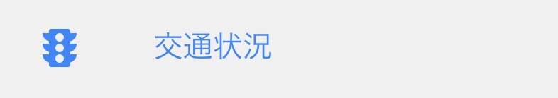 この項目を選択すると黒文字から青文字に変わり 機能が反映されます。 道路の交通状況が色別に表示される機能です。 ・緑 = スムーズ ・オレンジ = 混み始めや信号詰りなど ・赤 = 渋滞・混雑など 今では、最初に表示されたルートがあっても 混み状況を自動に見て、スムーズに進めるルートに 修正し案内してくれるようにもなっております。 出発前にこの表示を確認しておくと、 どのルートで目的地まで行くか決めやすいと思います。