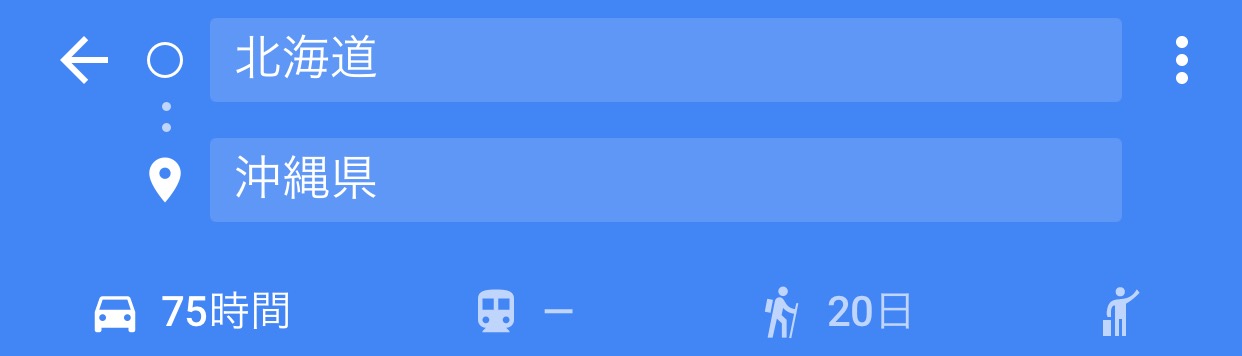現在地からではなく、仮定する場所から目的地までの ルートを指定検索する時に活用ができるメニューです。 もちろん現在地から目的地も選択可能です。 ここでは、移動手段を車・公共交通機関・徒歩・フェリーから 状況によっての検索ができます。 車の場合はさらに高速道路や有料道路の使用の有無の選択や 海を渡って移動が必要な場合はフェリー使うかどうかを選択できます。 公共交通機関では電車やバスなどの様々なルートや オプションとしてどちらを優先させるかも選択でき、 さらに、細かい経路の指定(乗車や徒歩が少ないなど)もできます。 一番便利なのは、時刻設定も出来ることです! 発車時刻もしくは到着時刻に合わせて検索することが可能です。 検索された結果からJRやバスの時刻表も確認出来るので イレギュラーが発生した時の為に事前に次の手も 考えておけるので非常に便利です。 徒歩の場合にもフェリーの使用の有無が選択できます。