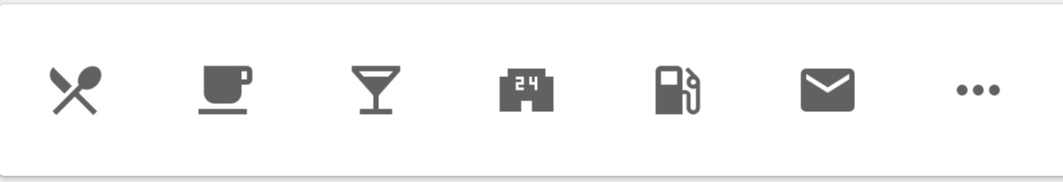 検索窓を選択すると少し下に表示されます。 移動中に寄りたい場所が出てくることもあると思うので この機能も活用できれば便利です。 【主なサービス】 ・コンビニ ・郵便局 ・駐車場 ・ガソリンスタンド ・100円ショップ ・図書館 ・スーパー ・病院 ・薬局 ・花屋 ・銀行 ・カフェ ・レストラン など ルート検索前でも検索が出来ますし、 ルート案内中でも虫眼鏡マークから 追加で検索が可能です。 目的地に向かう途中にある指定した場所が いくつか検索されるので、都合の良い場所に 立ち寄ることが可能なので、 これも知らない方は損かもしれません!
