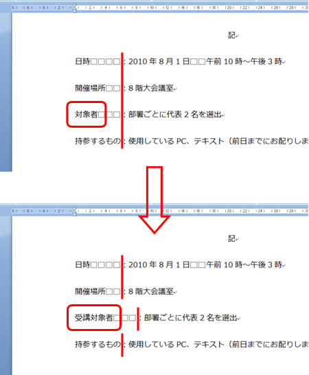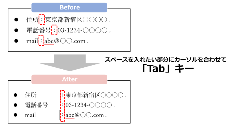 こちらもスペースの代わりにタブキーを設定することで、途中の頭を揃えて文書のレイアウトを整えやすくなります。