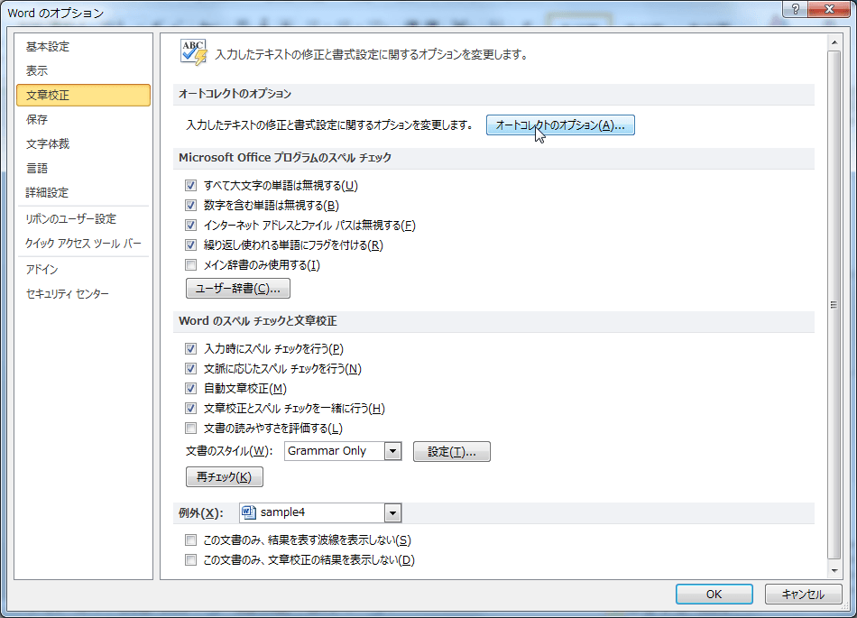 「ファイル」から「オプション」へ進み、「文書校正」をクリックします。
