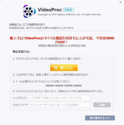 無料体験版では、動画の変換などが5分までしか行えない・高度な機能の制限・画面の録画時にVideoProcのウォーターマーク(透かし)が入るといった制限がかかります。