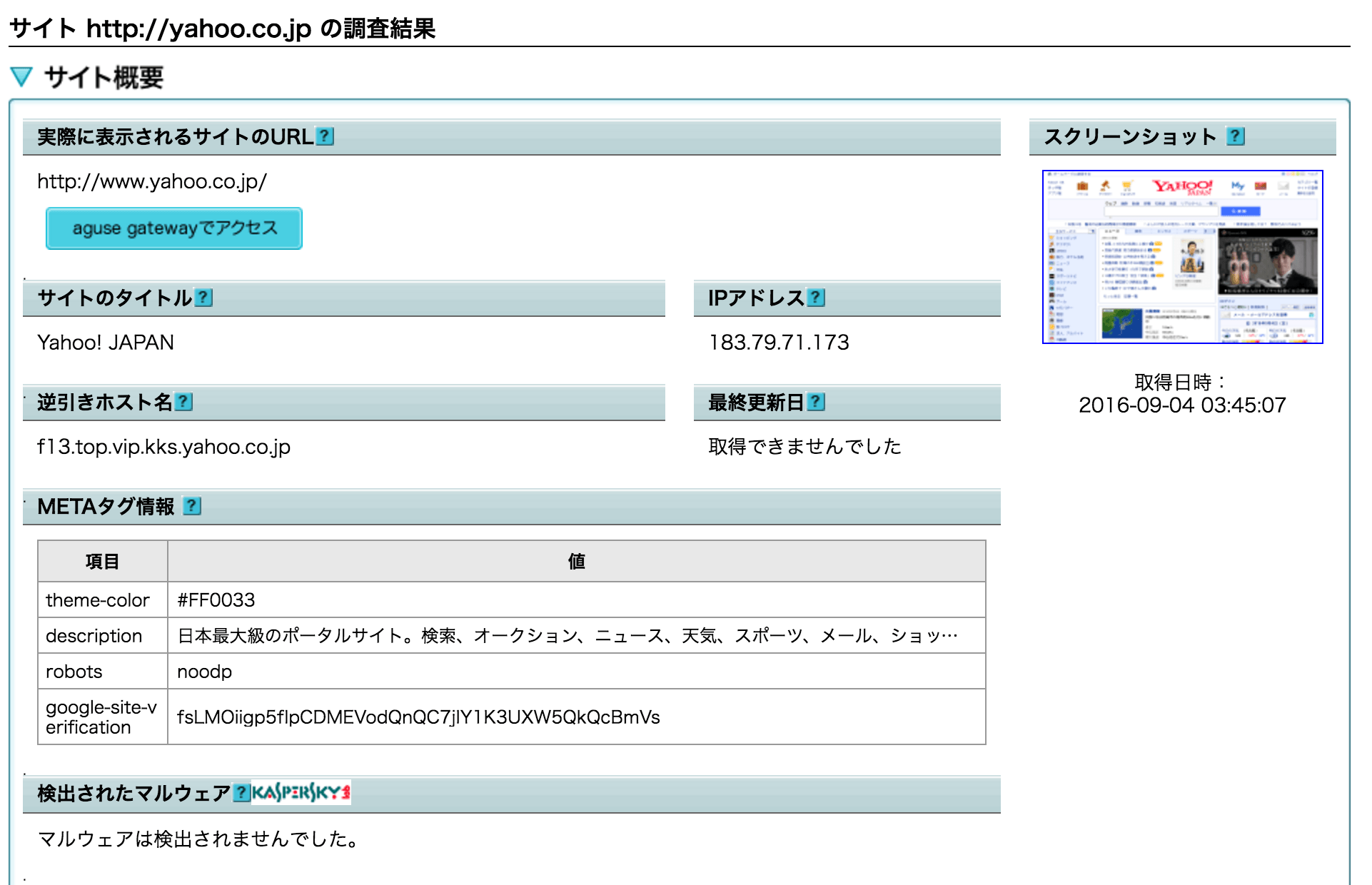 このように右側にWEBサイトのキャプチャ、マルウェアがあるかどうかなどの情報を調べてもらうことができます。 この情報をもとに安全であれば、実際にブラウザでアクセスをするという流れになります。