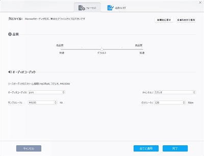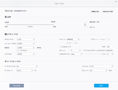 フォーマットメニューでは動画の品質やビデオコーデック・フレームレート・解像度・アスペクト比・ビットレートなどを細かく設定することが可能なほか、オーディオコーデックの設定も行うことができます。