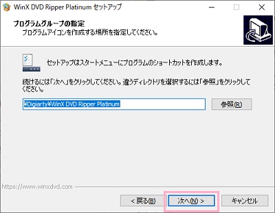 プログラムグループの指定も同様に、デフォルト以外の場所を選択する場合は「参照」から指定しましょう。「次へ」をクリックして進めます。