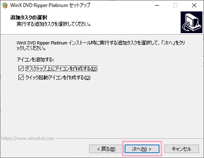 追加タスクの選択では、「デスクトップ上にアイコンを作成する」「クイック起動アイコンを作成する」の2つが選択できます。作成したいアイコンのチェックボックスをオンにして「次へ」をクリックしましょう。