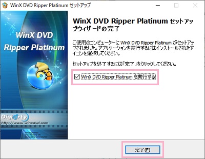 インストールが完了したら「セットアップウィザードの完了」が表示されます。「WinX DVD Ripper Platinumを実行する」のチェックボックスをオンにして「完了」をクリックしましょう。セットアップウィザードが閉じてからWinX DVD Ripper Platinumが起動します。