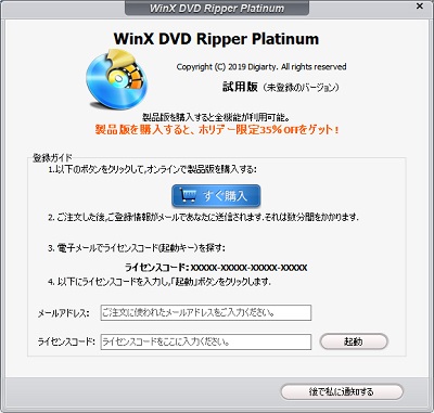 試用版なので、製品の購入リンクとライセンスコード入力画面が表示されます。。ライセンス登録を行う場合は「すぐ購入」ボタンをクリックして購入を、試用版をそのまま使う場合は「後で私に通知する」ボタンをクリックして進みましょう。