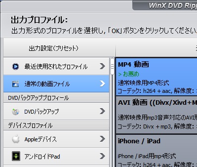 出力プロファイルの選択画面が表示されます。用意されているプリセットは大まかに分けて「通常の動画ファイル」「DVDバックアッププロフィール」「デバイスプロファイル」「Webビデオプロフィール」「一般的なビデオ/音楽プロフィール」の5つです。