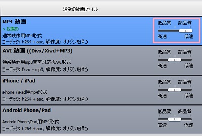通常の動画ファイル:MP4やAVIなど、一般的な動画形式のプロファイルが用意されています。