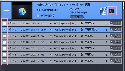 メインウィンドウに、DVDのタイトル一覧が表示されます。タイトルの左側に表示されているチェックボックスをオンにすることで、リッピングするタイトルを選択することができます。また、リッピングの詳細設定を行いたい場合はリスト右上の設定ボタンをクリックしましょう。