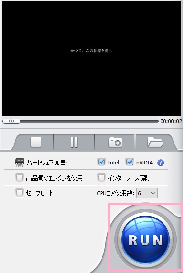ウィンドウ右側には、プレビュー画面とハードウェアアクセラレーションメニューが用意されています。「ハードウェア加速」のチェックボックスをオンにすることでグラフィックボードを使用してエンコードを行います。また、「高品質のエンジンを使用」で高品質の変換・「インターレース解除」で動画に入る横線を解除することができます。
