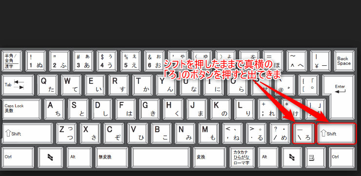ここからは、英語キーボードでアンダーバーを打つ方法ですが、日本語とはキーボードが違うため、「ろ」のキー自体がないことに気付くと思います。